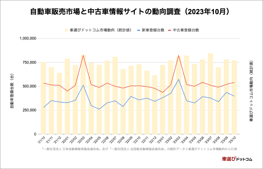 2023年10月における自動車登録台数の推移と、中古車情報サイト「車選びドットコム」の販売数推移から、中古車市場の動きを分析していきます。