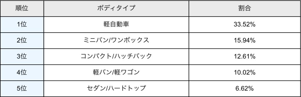 次点でミニバン/ワンボックスなど家族向けや積荷車として用いられるボディタイプが人気でした。