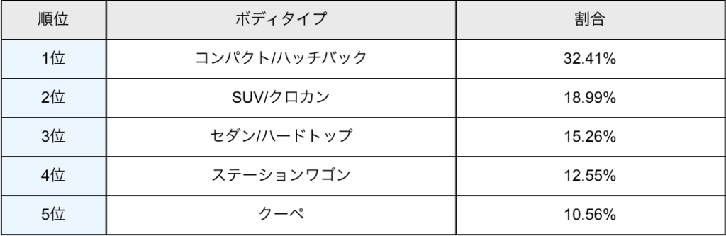 2022年度、輸入車で最も人気だったボディタイプはコンパクト/ハッチバックでした。こちらも全体の1/3に迫る割合を占めています。また、輸入車ではSUV/クロカンも人気な傾向にあることがわかります。