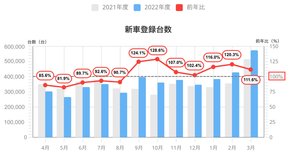 こちらのグラフは、2022年度の新車登録台数の推移を表しています。