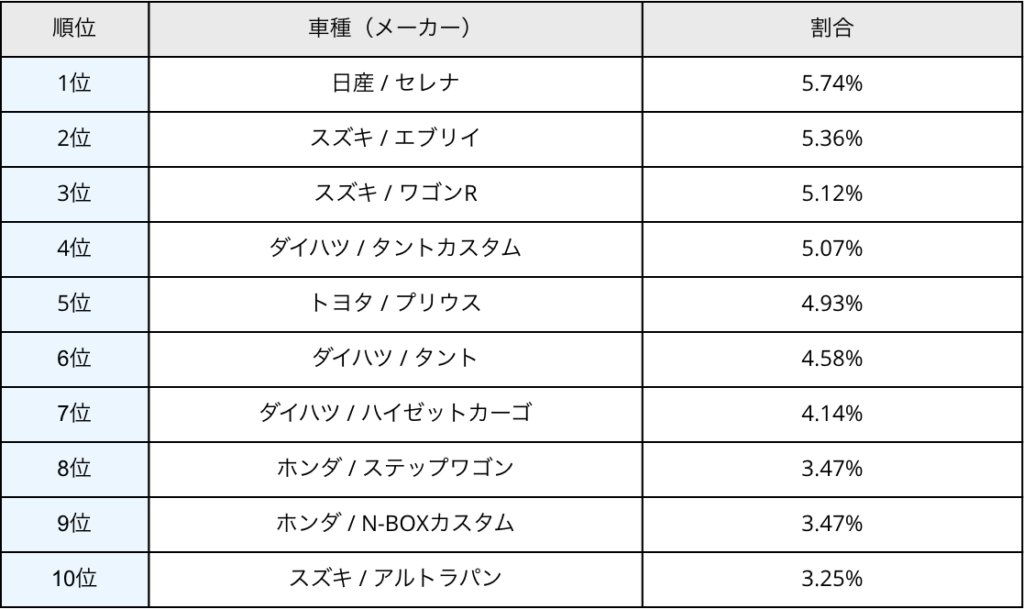 2022年度、国産車で最も人気だったのはセレナ(日産)でした。10位以内にはスズキ、ダイハツといったメーカーが多くランクインしていることもわかります。