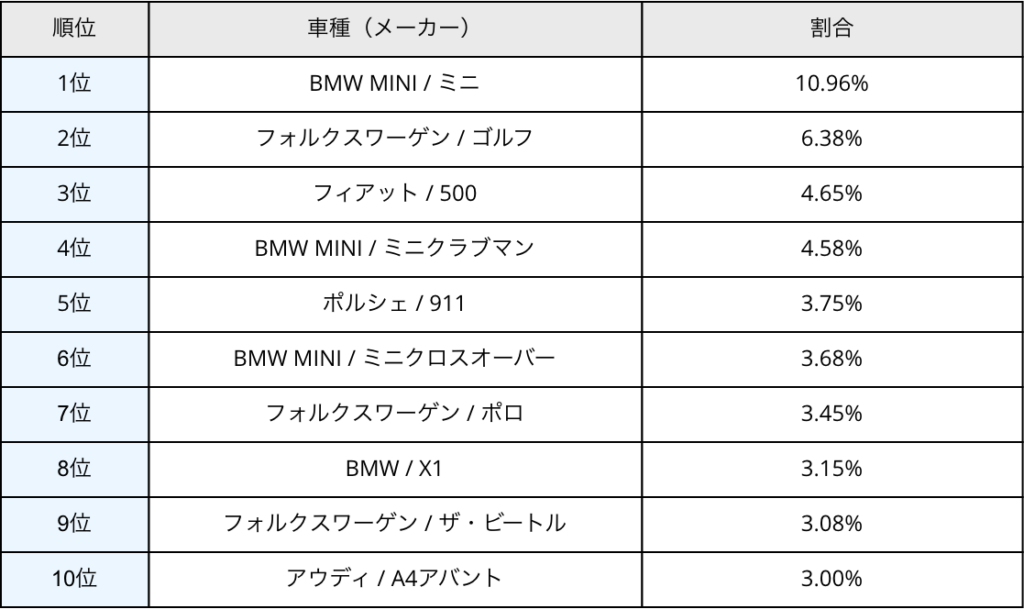 2022年度、輸入車で最も人気だった車種はミニ(BMW MINI)でした。こちらは圧倒的な人気で、全体の10%ほどを1車種で占めています。さらに、10位以内にBMW MINIの車種が3車種ランクインするなど国内のMINI人気が伺えます。また、ランキングを見るとフォルクスワーゲンも多くランクインしていることがわかります。
