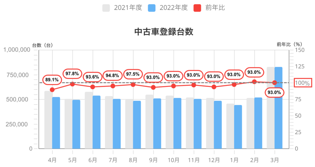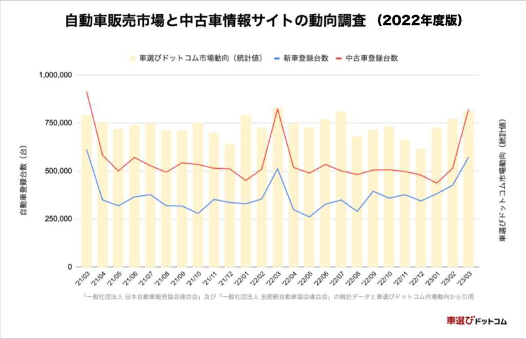 2022年度における自動車登録台数の推移と、中古車情報サイト「車選びドットコム」の販売数推移から、中古車市場の動きを分析していきます。