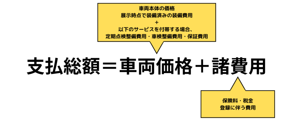 支払総額とは、「車両価格」にその中古車を購入する際に最低限必要な「諸費用」を加えた価格を指します。ただし、陸送や県外納車をお客様が希望された場合は、希望に応えるための費用(県外登録費用、陸送費用など)を別途オプション料金として請求することができます。
