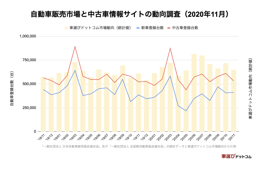 2020年11月における自動車登録台数の推移と、中古車情報サイト「車選びドットコム」の販売数推移から、中古車市場の動きを分析してきます。