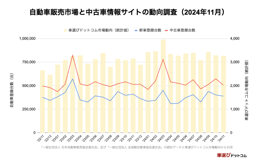 2024年11月における自動車登録台数の推移と、中古車情報サイト「車選びドットコム」の販売数推移から、中古車市場の動きを分析していきます。