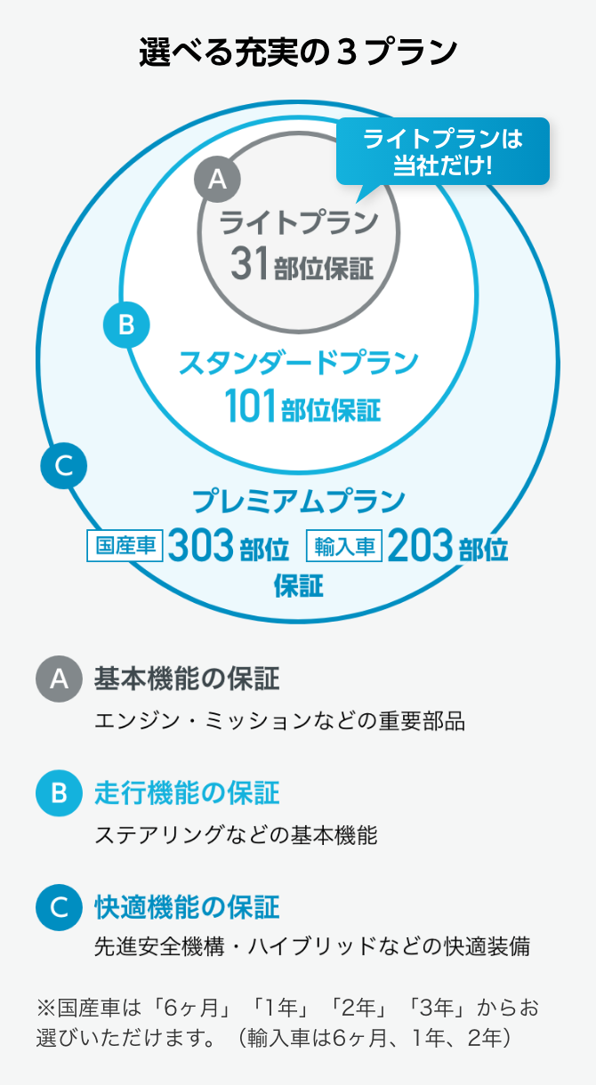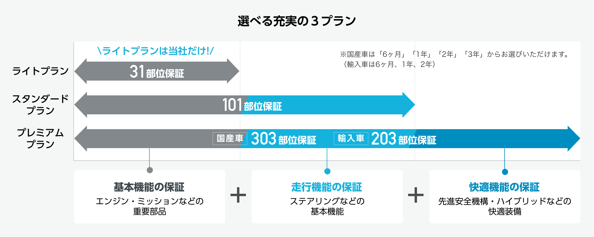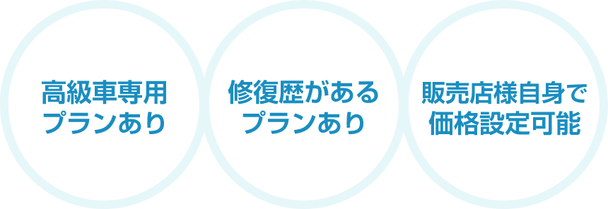 遠方のお客様にも安心感をお届け! - 幅広い車種にご加入いただける上、保証範囲に応じて3つのプランを用意しておりますので、お客様のニーズに合わせたプランをご提案いただけます。保証の内容以外にも、充実のアフターサービスや保証付帯の簡単さから、ユーザーの皆様はもちろん、多くの加盟店様にも支持されております。
