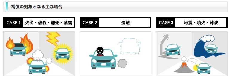 商品車を様々なリスクからお守りし、不測の事態からお守りします。火災等はもちろん、地震、落雷、津波や盗難被害まで幅広く補償が受けられます。