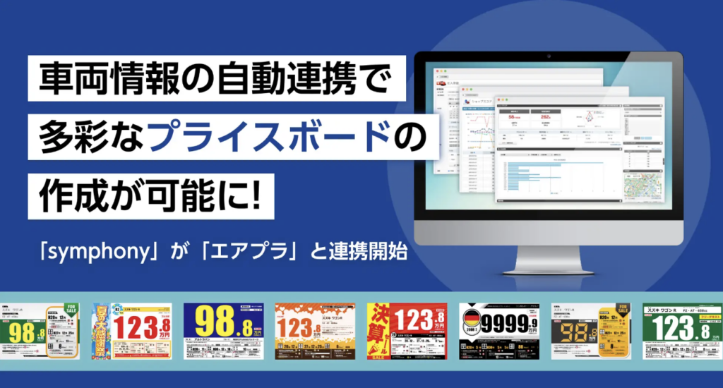 本連携は中古車販売店様が「symphony」の仕入車両情報へ登録された車両情報を、イプラ社が提供する「エアプラ」へ自動連携し、多彩なプライスボードをカンタンに作成できるようになるものです。車名や金額、走行距離など法令記載義務項目全てを自動転送する事ができます。