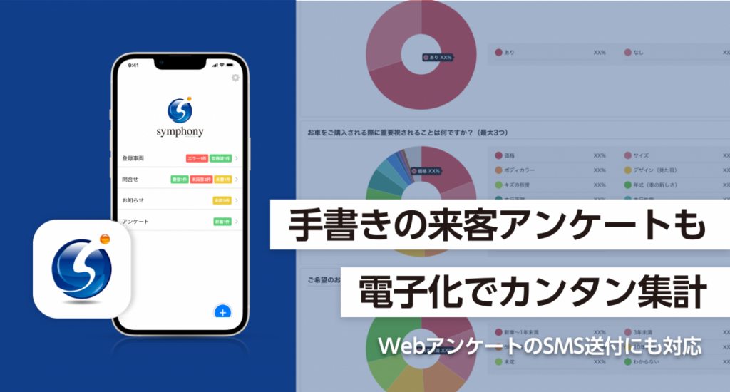 ファブリカコミュニケーションズ(本社:愛知県名古屋市中区、代表取締役社長:谷口 政人)は、2023年3月7日、スマートフォン用「symphonyアプリ」(iOS版)に、新機能としてアンケートシステム機能を導入しました。これにより、symphonyを利用している中古車販売店様は、来店アンケートを簡単に行うことができ、さらに顧客情報や傾向を正しく把握することが可能となります。