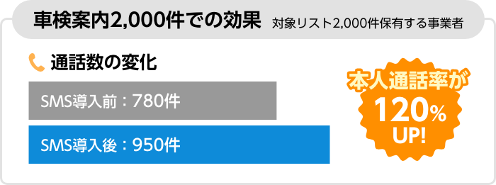 実際に車検案内のためTELアポを行っている販売店様に協力いただき、事前にSMSを送信し効果検証を行ったところ、2,000件の架電に対し、本人着信率(通話率)が導入前780件から導入後は950件と、170件(120%)も向上しました(※2)。