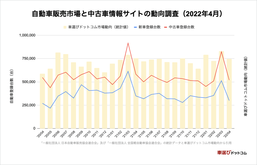 2022年4月における自動車登録台数の推移と、中古車情報サイト「車選びドットコム」の販売数推移から、中古車市場の動きを分析していきます。