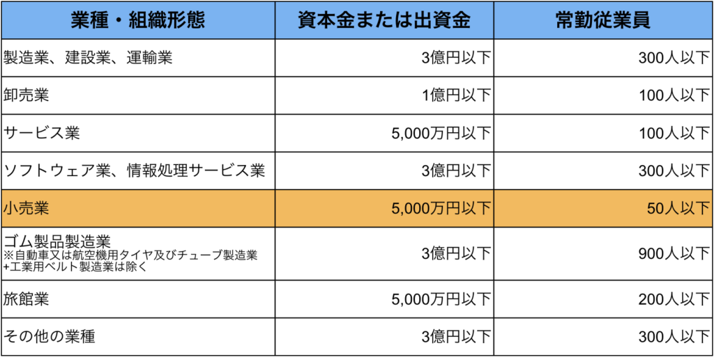 中小企業の定義は以下の通りです。