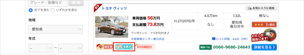 また、車選びドットコムでは中古車を探しているユーザーのそういったニーズを汲み取り、写真登録枚数が30枚以上の車両には、サイト内検索にかかりやすくなる仕様になっています。