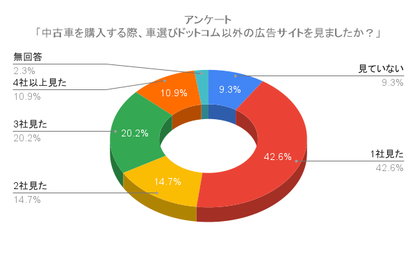 弊社が2020年12月から実施しているユーザーアンケートでは「中古車を探すために車選びドットコム以外のサービスをご利用になられたことがありますか?」という質問に対し、88%以上の方が複数サイトを参考にしていると回答しています。