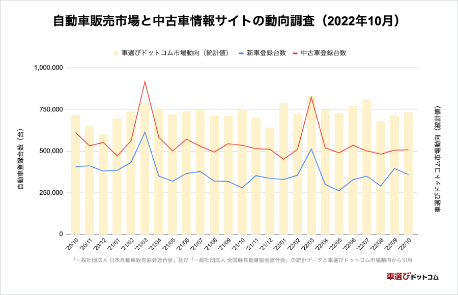 2022年10月における自動車登録台数の推移と、中古車情報サイト「車選びドットコム」の販売数推移から、中古車市場の動きを分析していきます。