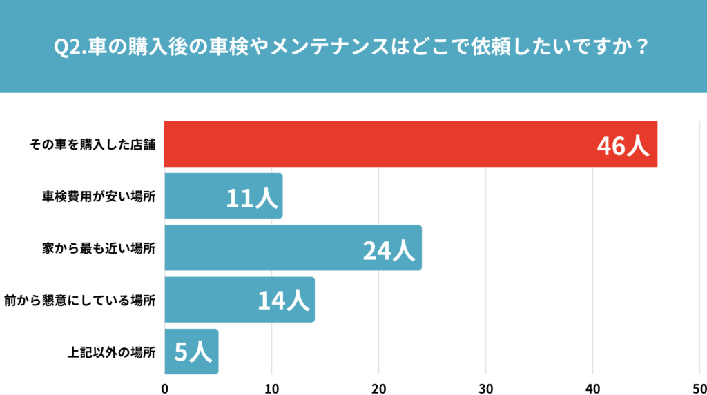 下の図は弊社が独自で行ったアンケートの結果を抜粋したものですが、このアンケート結果から顧客の視点からも車を購入した店舗での車検やメンテナンスを求めていることがわかります。前から懇意にしている場所を含めると、実に顧客の半数以上がリピーターになる可能性を秘めているといえます。