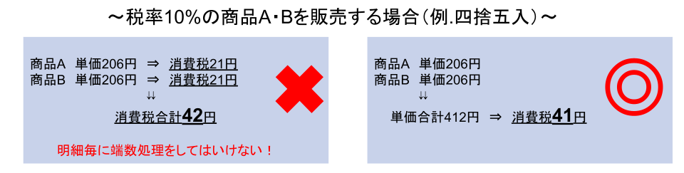また、請求書への記載項目が増えたほか「税率ごとに区分した消費税額等の端数処理は、一つの適格請求書につき税率ごとに一回ずつとする」、といった計算方法の変更を行う必要もあります。従来は以下の図のように「車両本体価格,課税諸費用など大項目ごとに消費税計算」をしても問題ありませんでしたが、インボイス制度では、「税率が同じものは全て合計した上で、合計金額に対して消費税計算を行う」といった計算方法に変更する必要があります。