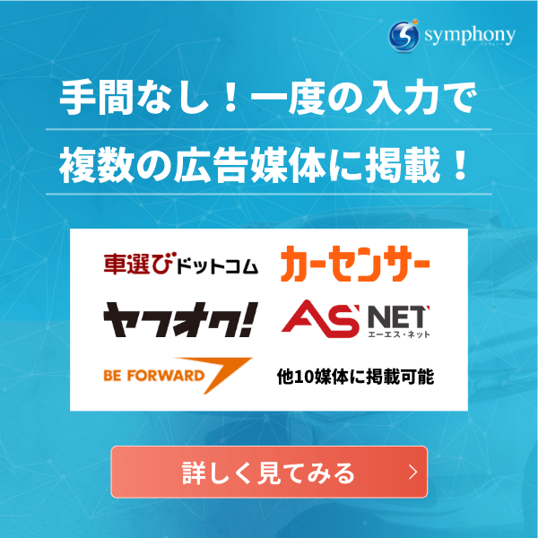 法人の場合、中古車販売管理システム「symphony」の導入で手数料(出品料・落札料)無料で車を出品することが可能です。詳しくは、本記事の「出品方法③ 厳選中古車オークションで出品する」をご確認ください。