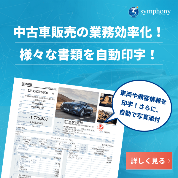 当社の提供する中古車販売管理システム「symphony(シンフォニー)」では、粗利計算や仕入内容の集計など、経営管理機能をご利用いただけます。